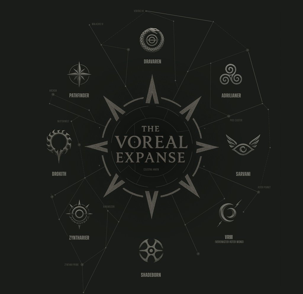 Cartographically classified as Primary Arc 0-A to 13-F. As a neutral hub, Celestial Haven marks the galacto-geometric center and, at the same time, the seat of government for the Zynthar. It serves as a reference for all cartographic and navigational systems. Borders the Obscura Rift in the west and the unknown Verge-Outer Rim in the east. Subregions are not subject to a unified administrative structure and are therefore not listed. The first mention of the term "Voreal" is found in an inscription on the abandoned moon Kaer'Thal, dated to approx. 280,000 B.A.R. (before Azarithan Reckoning) .