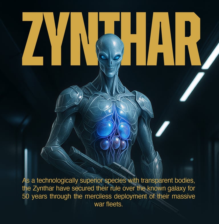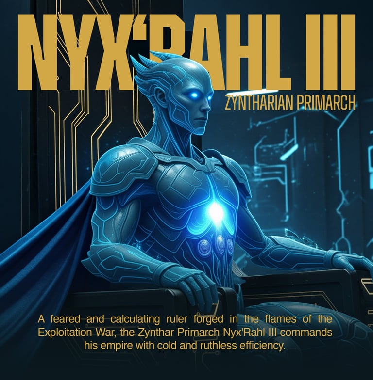 The Zyntharian Empire: Led by the ruthless Primarch Nyx'rahl, the Zyntharians are a technologically advanced and dominant empire seeking to maintain control over the galaxy. Their motivation is rooted in a belief in their own superiority and a desire to exploit resources and subjugate other races to fuel their expansion.