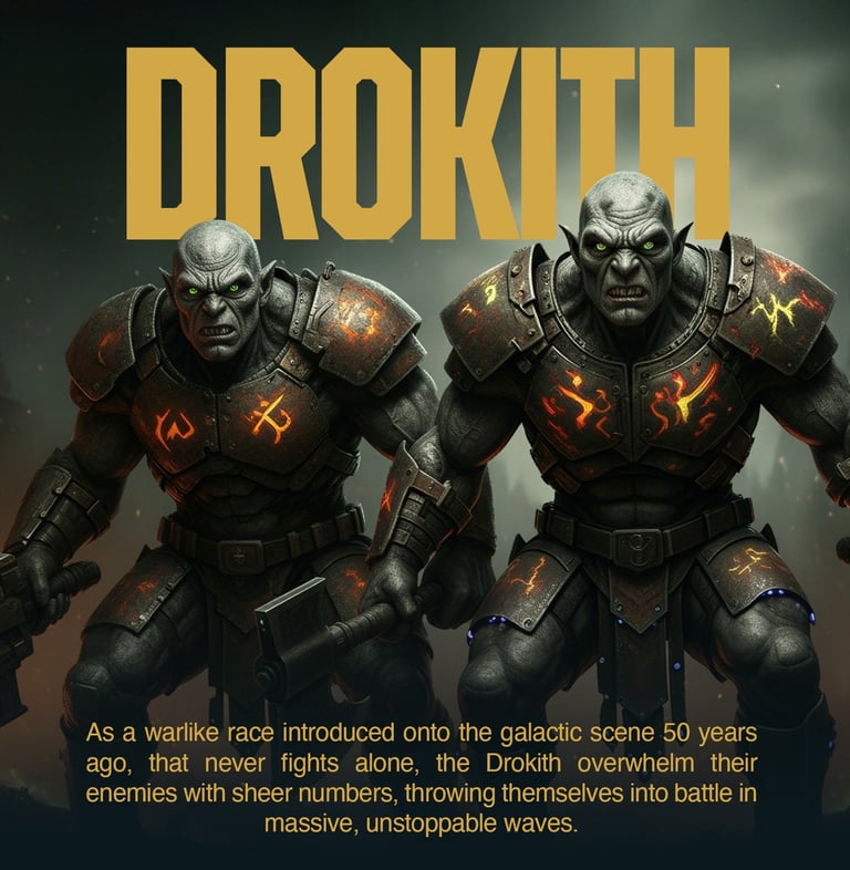 The Drokith: A warlike and honor-bound race, the Drokith are driven by a prophecy to find a powerful artifact.Their relentless search and military expansion bring them into direct conflict with other factions, as they see the artifact as their birthright to secure absolute dominion over the galaxy.