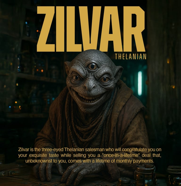 The Lead-Eater Syndicate: A powerful criminal organization that deals in high-stakes loans and unforgiving terms. Prota gets entangled with them after taking a loan from their agent, Zilvar, to purchase SAR. Their motivation is purely profit and power within the galactic underworld, and they are merciless in collecting their debts.